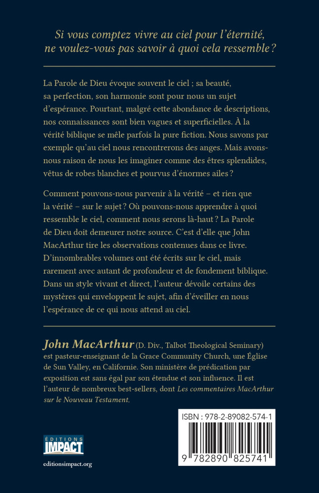 Edité en 1999 par la Maison de la Bible, cet ouvrage proposait en annexes : un sermon de J.C. Ryle, et un sermon de Charles H. Spurgeon. Cette édition remplace les deux sermons de l’édition initiale par trois pseudo-récits de voyages au ciel. John MacArthur décrit et dénonce les croyances et les erreurs véhiculées par ces témoignages. Cet ouvrage est une étude approfondie du sujet avec de nombreuses références bibliques. Il est un encouragement pour l'avenir ; le ciel est bien plus qu’un symbole d’émerveillement, c’est un endroit réel !