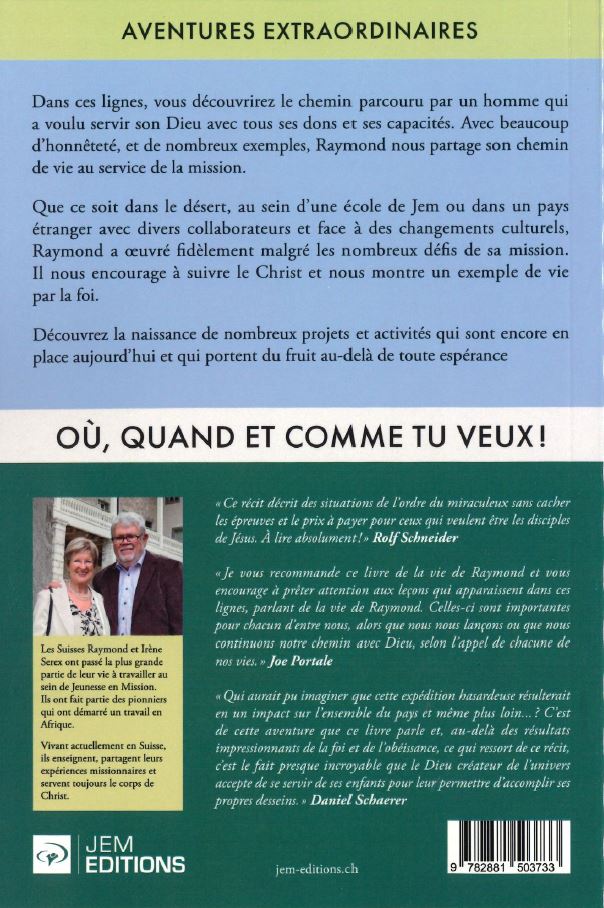 Cet ouvrage montre la fidélité de Dieu quand il appelle à son service pour la vie. C’est un témoignage puissant et encourageant qui nous défie à aller au-delà de nos propres limites et voir Dieu agir d’une manière extraordinaire. L’auteur nous partage ses expériences avec honnêteté et humilité, il ne cache pas les épreuves et le prix à payer pour ceux qui veulent être disciples de Jésus. Ce récit montre l’obéissance, la persévérance et le courage de l’auteur et de son épouse, pour marcher par la foi malgré les difficultés. A la fin de plusieurs chapitres, les conseils, réflexions et questions de l’auteur nous permettent d’avancer et d’approfondir le sujet. En fin d’ouvrage, une série de photos souvenirs nous font découvrir les lieux et les personnes concernés.