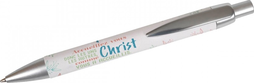 Stylo à bille Mot d’ordre 2022 blanc, avec impression branches sur tout le pourtour.